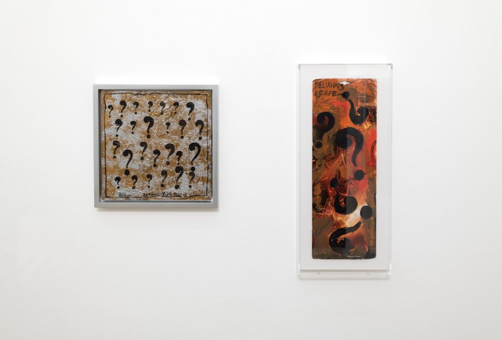 Another picture from this series is Delirious Escape (2020). This is a very slim vertical-format work with an overall red-orange glow; it’s covered with lightning bolts, dark figures, and dancing question marks painted black (actually commercial packaging overpainted to allow the remains of the image/text to show through). And when I imagine that reigning behind this apocalyptic wall of fire is absolute chaos – absolute horror, as perhaps inside a black hole or on earth.