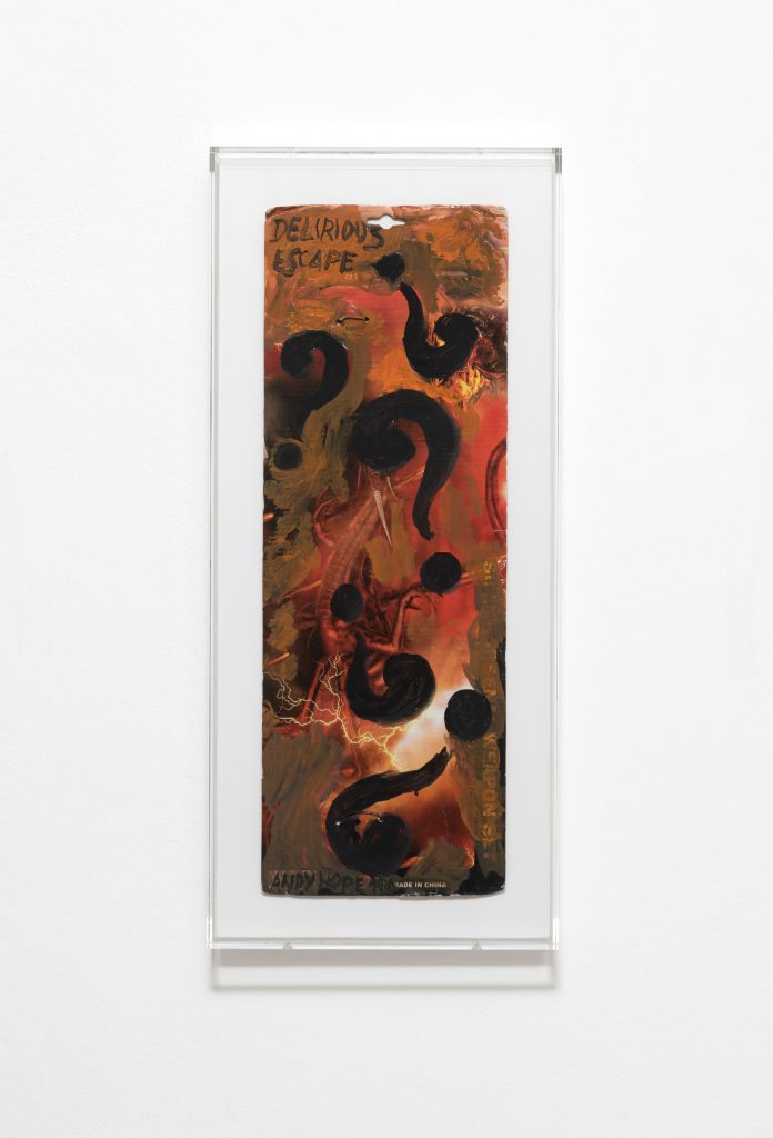 Auch Delirious Escape (2020) ist ein Bild aus dieser Serie. Ein sehr schlankes Hochformat, das rot-orange glühend mit Blitzen, dunklen Wesen und mit schwarz gemalten, tanzenden Fragezeichen überzogen ist. (Dabei handelt es sich um eine übermalte Originalverpackung, die noch Reste von Abbildungen/Aufschriften durchscheinen lässt). Und wenn ich mir vorstelle, dass hinter dieser apokalyptischen Feuerwand das absolute Chaos regiert – das absolute Grauen, wie vielleicht im Inneren eines Black Holes oder auf der Erde.