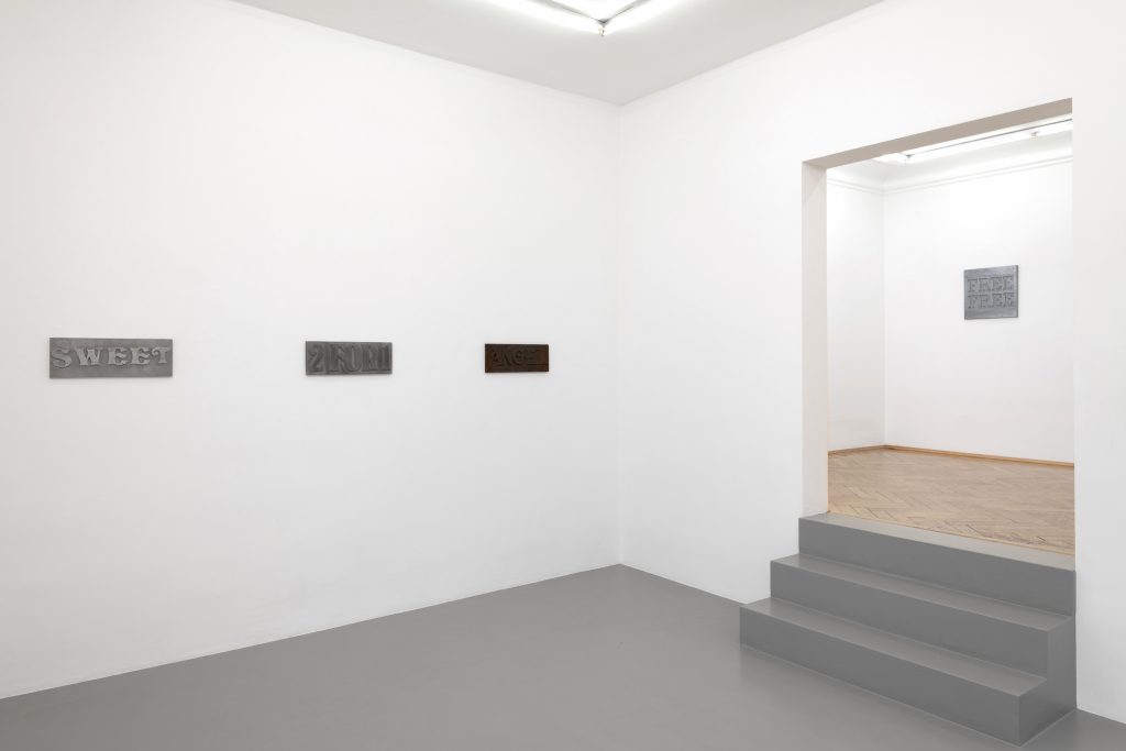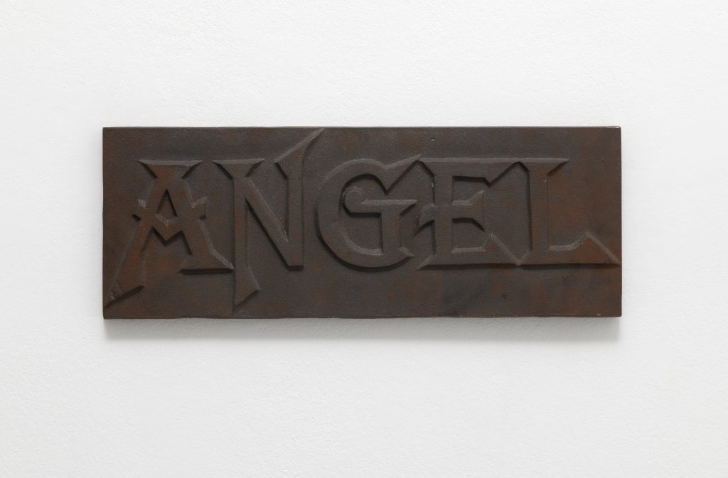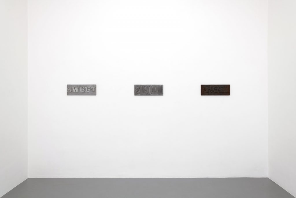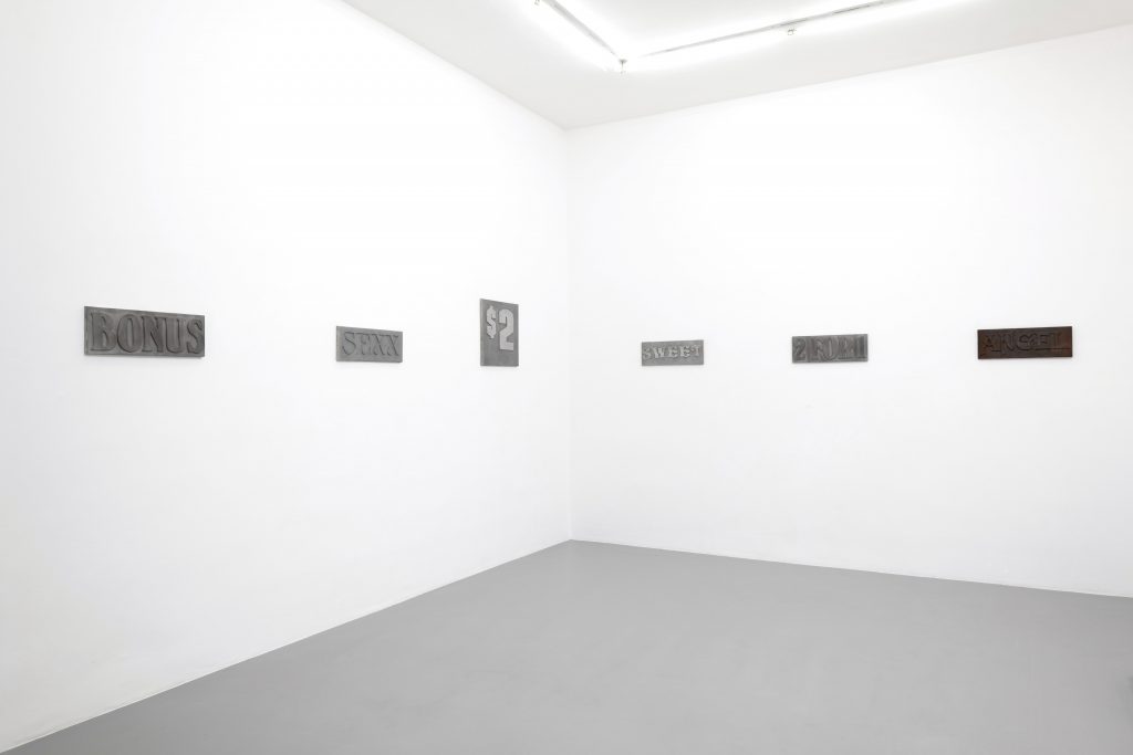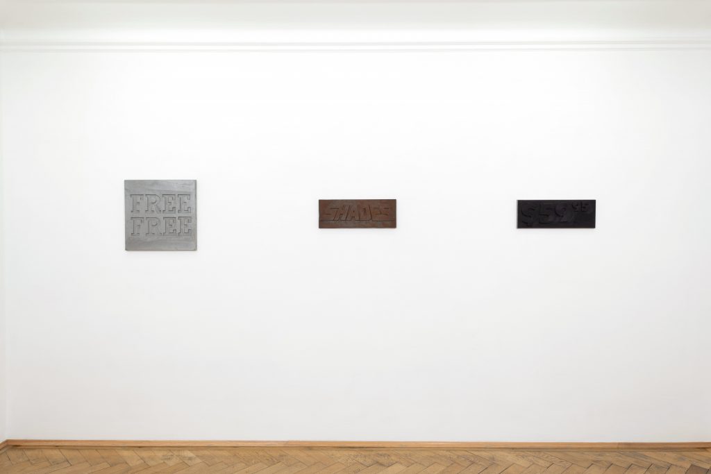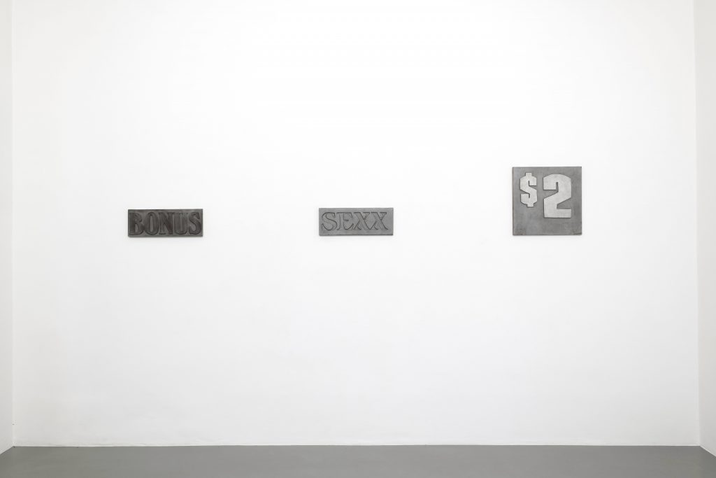 It is for this reason that Hans-Jörg Mayer can also exhibit what he paints. In 1988, the Kunstverein München showed the aluminum cast BLONDE. But in 2025, Munich Sentimental brings together the casts BONUS, $55,95, 2FOR1, SEXX, SWEET, ANGEL, SHADES, FREE FREE, and $2. In aluminum and in iron, everything seems to have been said. That does not mean that everything is also shown. It means rather that the what is shown as text. This is not hidden in a book and cannot even be definitively placed in time. I am reminded of the pages in Gesture and Speech in which André Leroi-Gourhan compares the arrangements in advertising with those found in cave painting. Mayer certainly worked in Hans-Sachs-Straße. In 1986 and 1987, he had the works produced in the Gießerei Mayer in Fraunhoferstraße. And now he is showing them in Liebigstraße in Galerie Christine Mayer. But should we speak of inscriptions or pictures? And why is $55,95 even more of a relief once the artist has painted over it with oil paint?